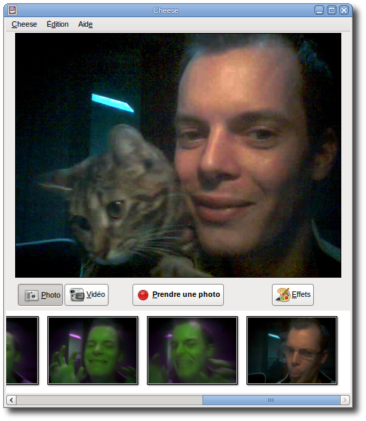 - Cheese : il s’agit d’une petite application qui prend en charge la webcam pour réaliser facilement des photos ou des vidéos. Ce logiciel se présente exactement comme Photo Booth sous Mac OS X (Tiger et Leopard) et permet en conséquence d’appliquer des effets de déformations et autres joyeusetés.